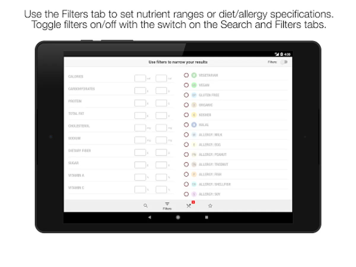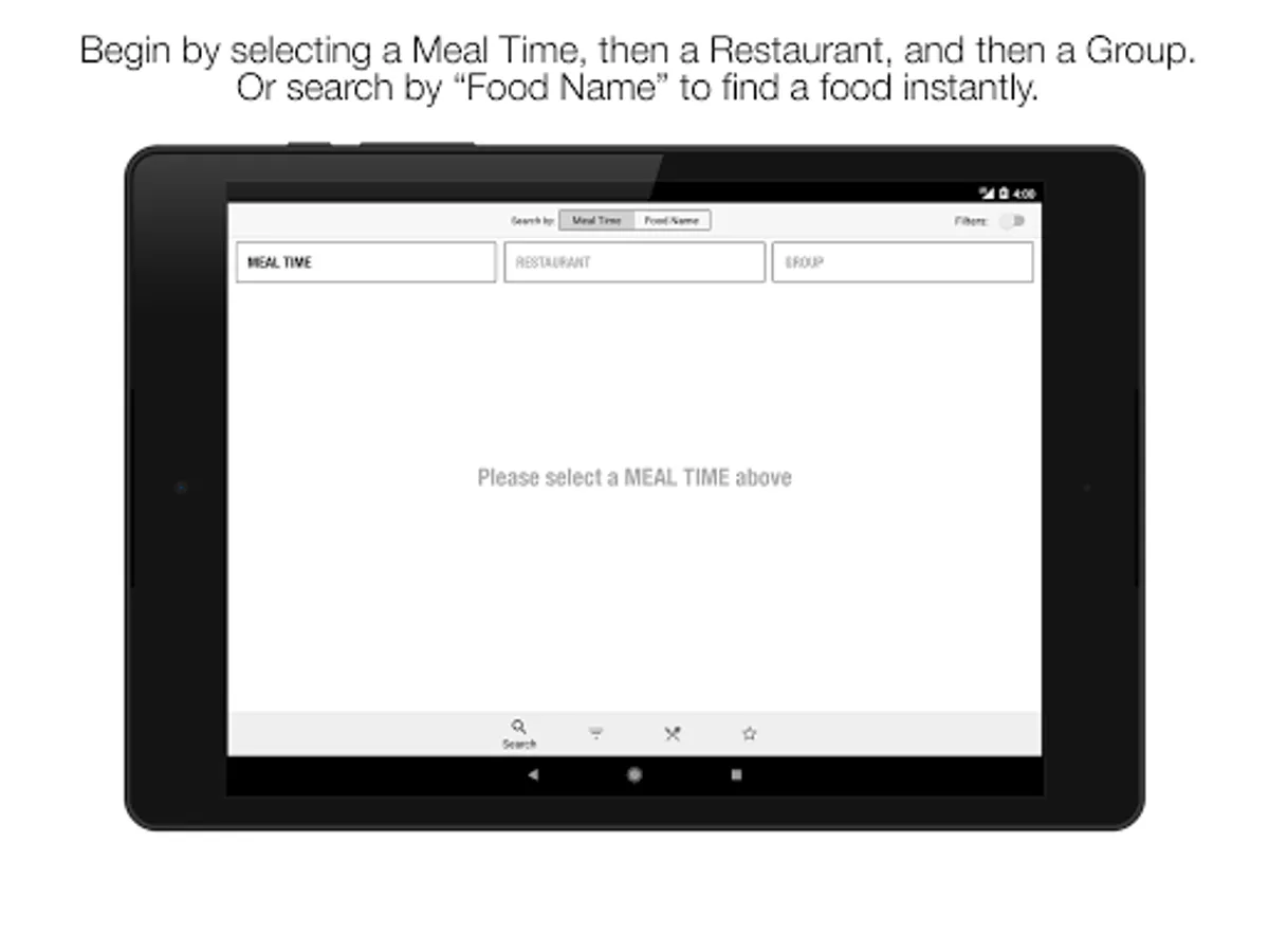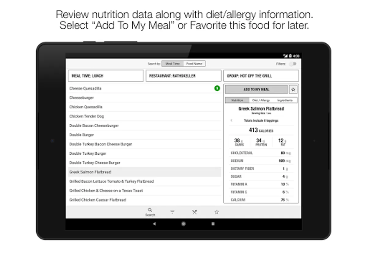 Apply filters to highlight foods that fall within specific nutritional ranges (i.e., between 0 and 20 calories), and restrict the results to foods meeting certain dietary choices (i.e., vegetarian, not soy allergy). Or search for a food directly by name and see when and where it is served.