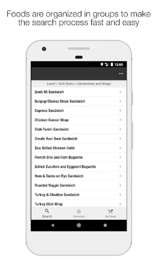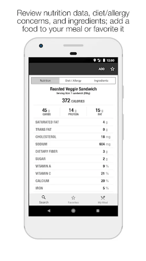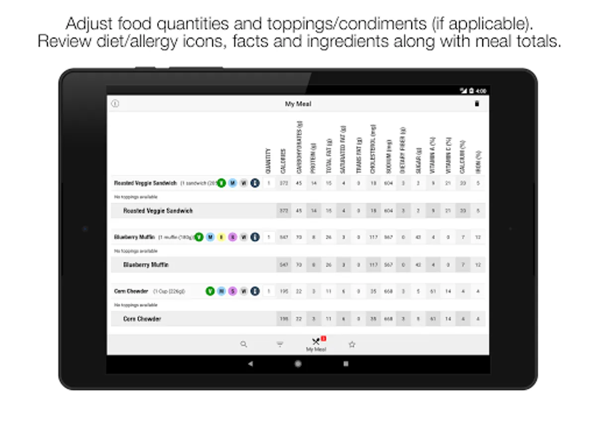 After configuring any toppings/condiments that may be available, add the food to your meal, and review your entire meal total to gain perspective on your dietary choices. And if you eat particular foods on a regular basis, favorite them to expedite future build-a-meal sessions.