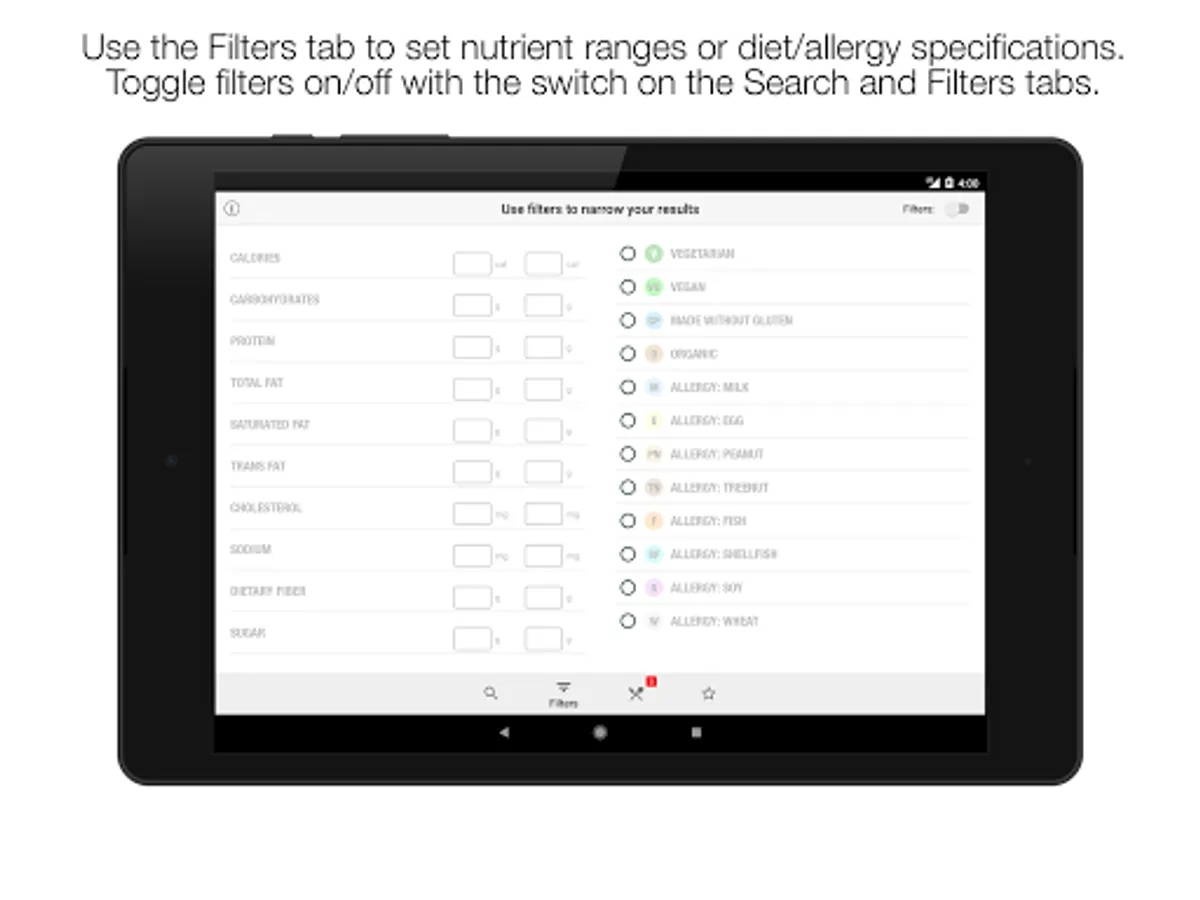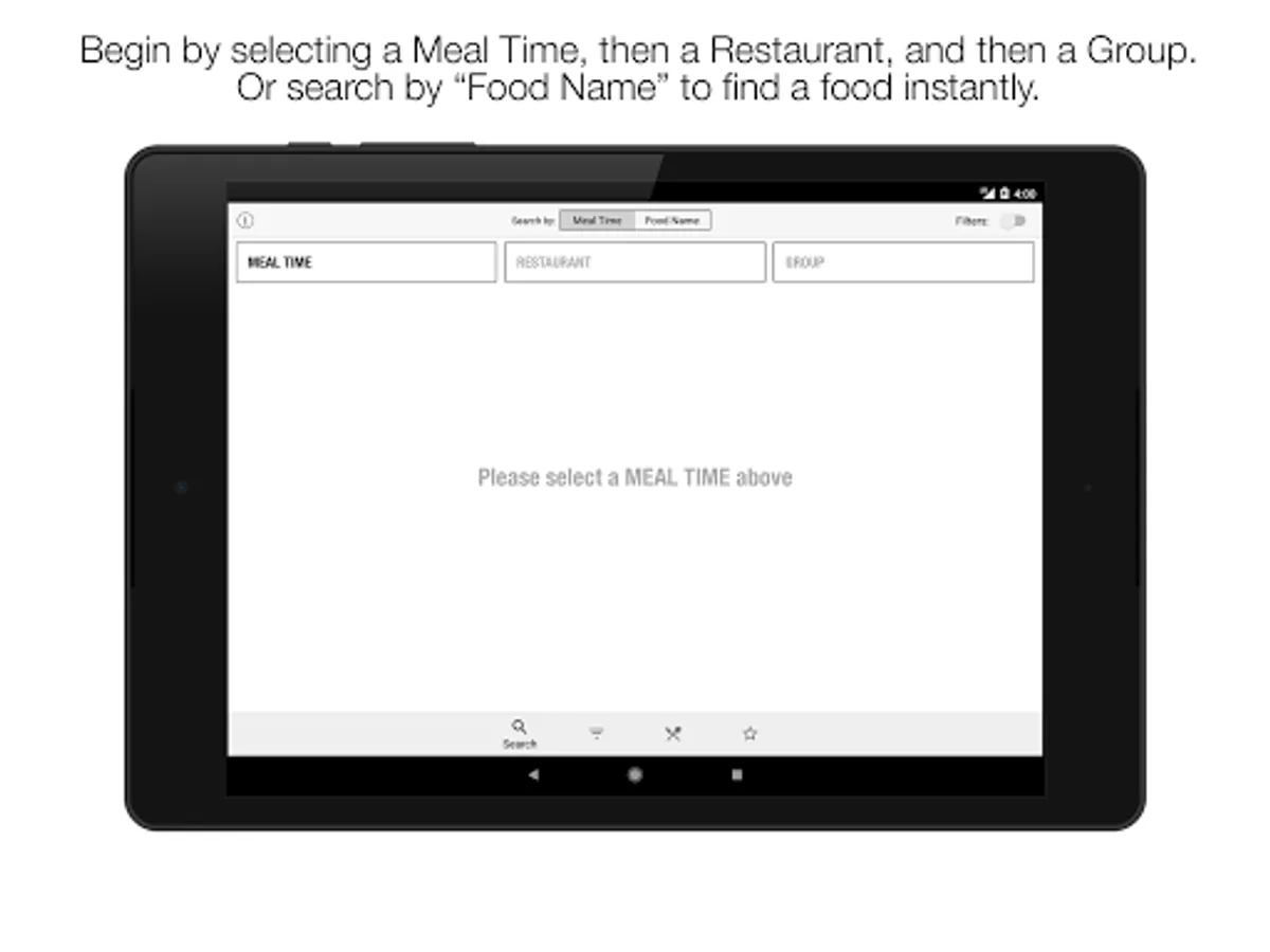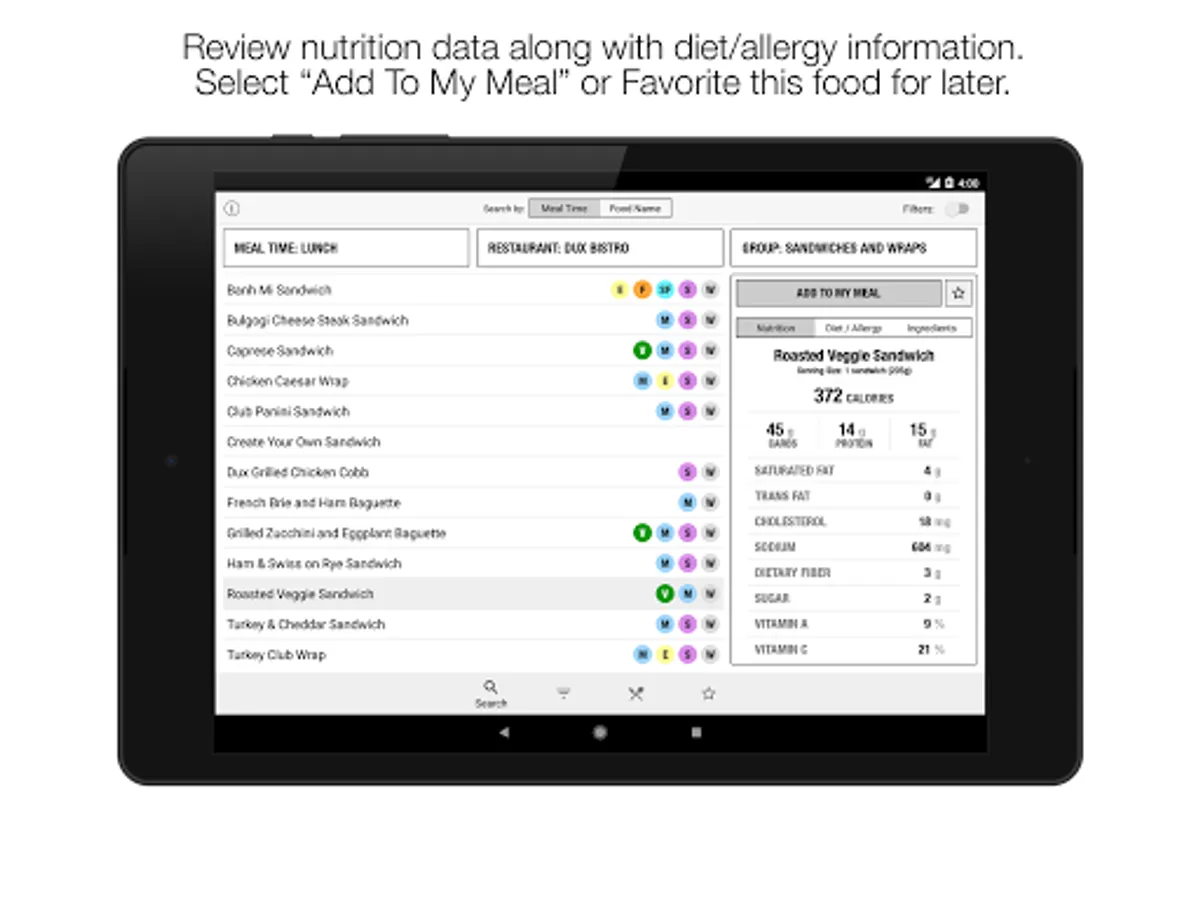 Apply filters to highlight foods that fall within specific nutritional ranges (i.e., between 0 and 20 calories), and restrict the results to foods meeting certain dietary choices (i.e., vegetarian, not soy allergy). Or search for a food directly by name and see when and where it is served.