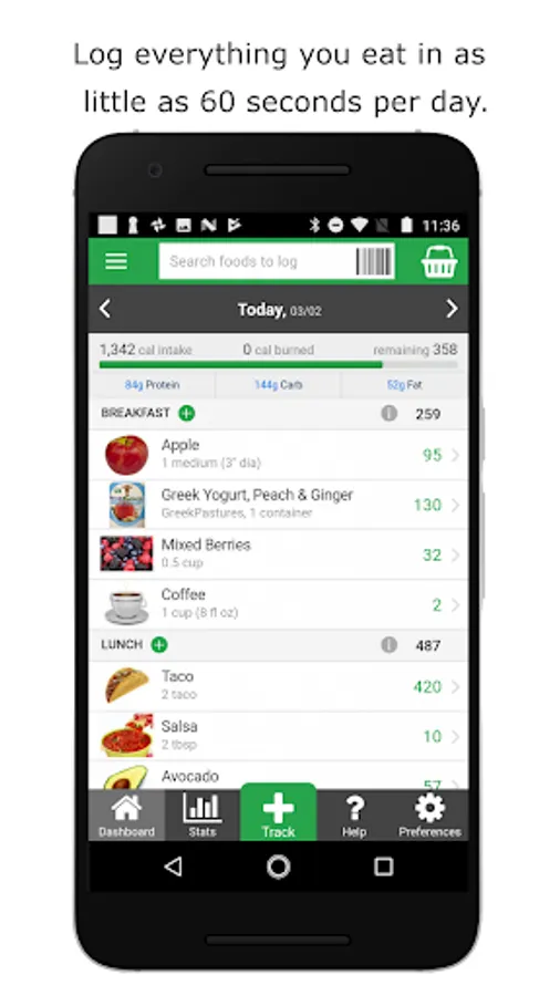Log all of your foods in as little as 60 seconds per day thanks to the following features:
