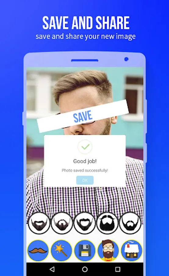 Apart from the beard and mustache editor, there are so many beard stickers available in this fun photo editor or realistic fake beard app. Choose the best stylish beard sticker from the available options such as crazy beard, stylish beard, small beard etc and apply it to your photo. Share your men beard photo on social media for your friends or save it on your SD card at your own convenience.