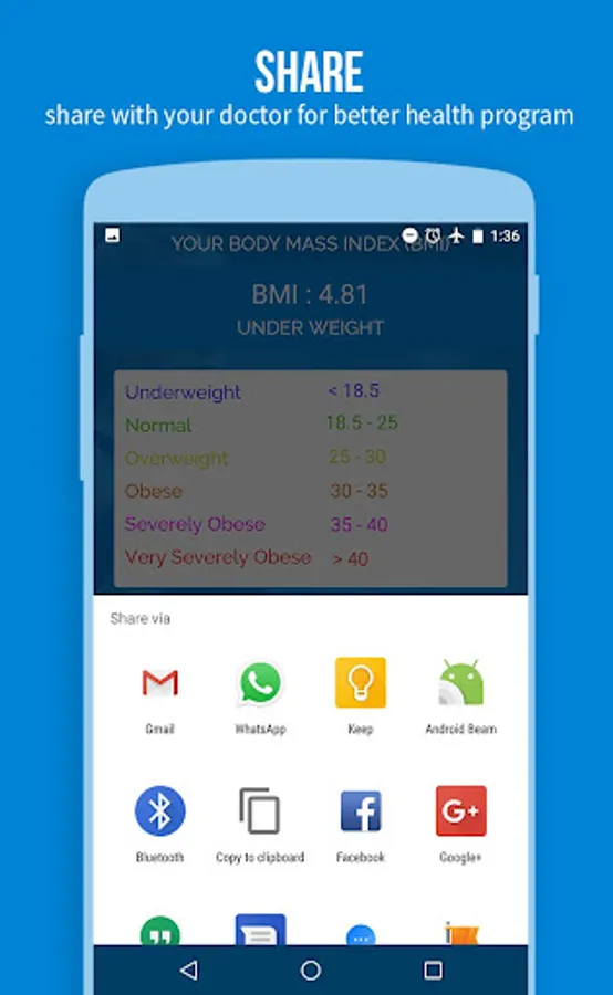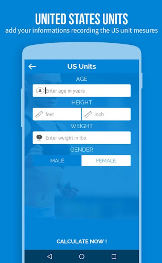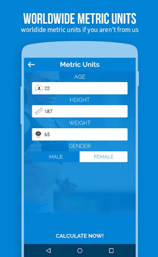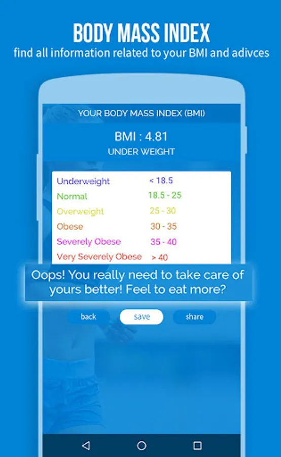 Are you in your ideal weight and shape? Do you want to get your desired weight? Check and know your ideal weight with this weight tracker app. It will calculate your body mass index and let you know if you are in good shape, under or over weight according to your age and gender!