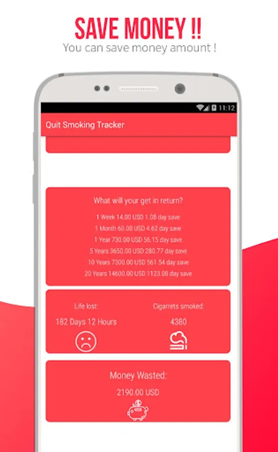 • You can also see how much life you lost, cigarettes you smoked and money you wasted on smoking
