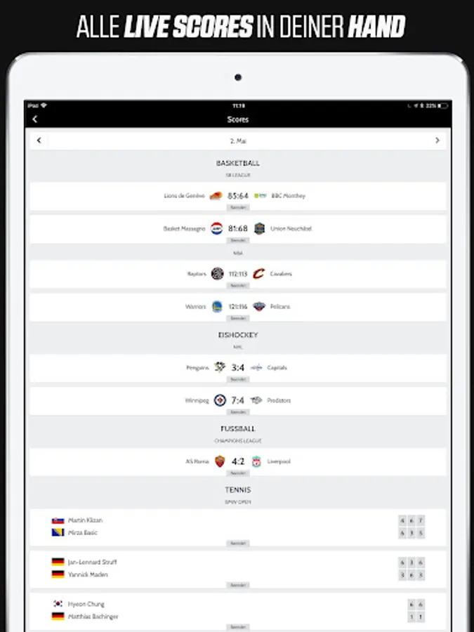 Live ticker, news, stories on: Tennis: Grand Slam tournaments and ATP World Tour Masters 1000 tournaments, Alpine skiing: all World Cup races for women and men, Formula 1: all Grand Prix including training and qualification