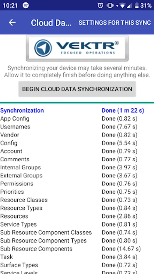 The following connection methods can be used to upload/download data to your device: Cellular; WiFi; 3G or 4G. All data are stored on your VEKTR® website; during synchronization, certain data are brought down to the device, such as Inspection Templates, Work Orders, Groups, Resources and Accounts. Data that are stored locally on the device, such as completed Inspections and Work Orders, will be uploaded to your VEKTR® website.