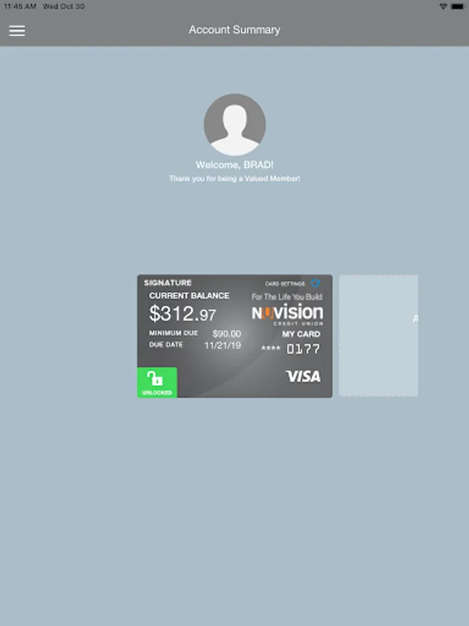 The Nuvision Debit and Credit Card Management app places all you need to control, monitor, and safeguard your credit and debit cards in the palm of your hand. Login quickly with Touch ID or Face ID and make your experience personal by uploading your own profile image, and customizing your controls and alerts to suit your lifestyle.