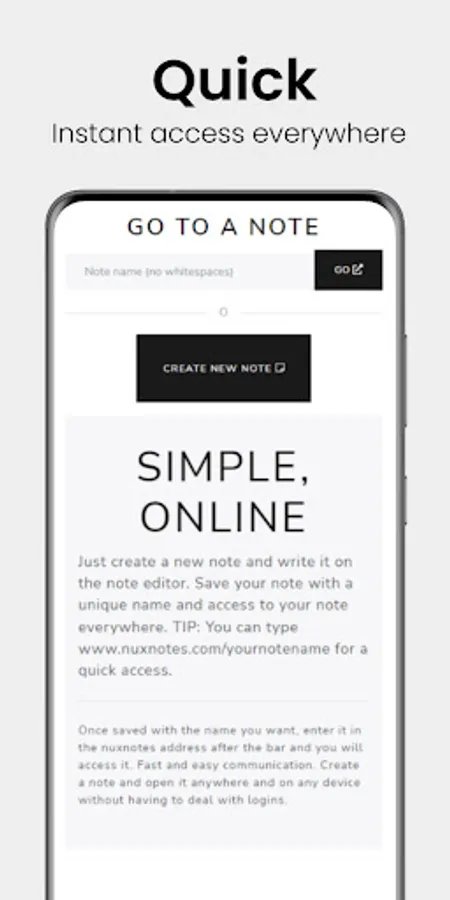 NuxNotes is a simple, anonymous and fast online notes app that allows you to create and share your ideas with the world. With NuxNotes, you can write text or voice notes, add images, emojis and stickers, and save them in the cloud or send them via email or social networks. NuxNotes is the ideal app for taking notes anytime, anywhere, without the need to register or log in. Download NuxNotes today and start creating amazing notes. Access from anywhere just by remembering the name. You can access the web version from any device through the browser, enter the name of your note and you're done.