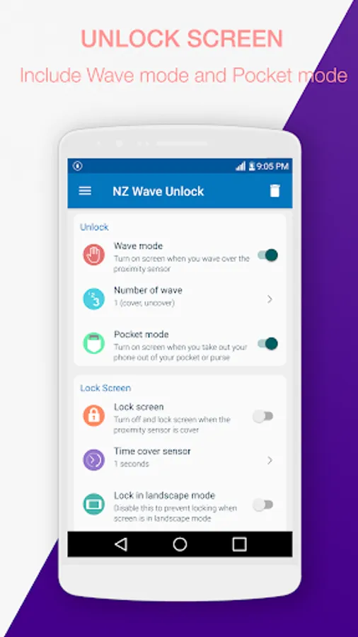 Wave Unlock is an app use Proximity sensor to unlock screen and lock screen by wave your hand over the proximity sensor. Wave to unlock is allows you to unlock your device just by waving your hand over the proximity sensor and cover Proximity sensor to lock screen.