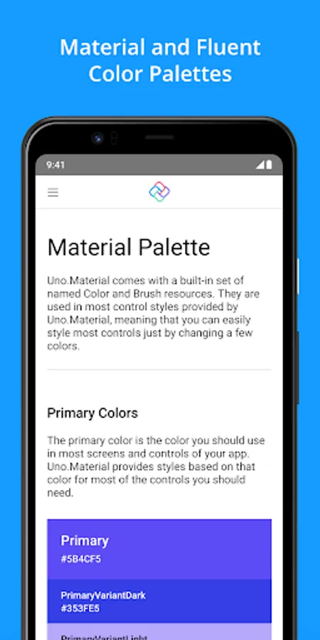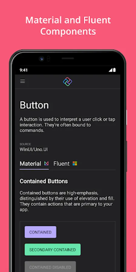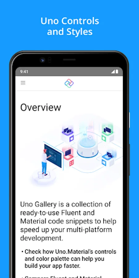 This application showcases Material and Fluent themes and additional features of Uno platform library.