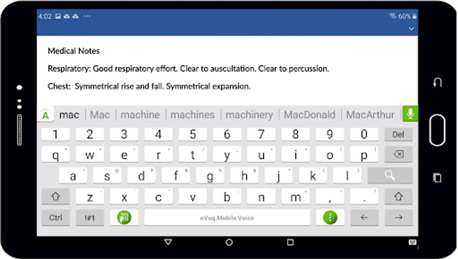 nVoq.Mobile Voice’s medically infused speech recognition optimizes your workflow, allowing for a more accurate, robust patient story in a fraction of the time. With a comprehensive medical vocabulary and predictive medical libraries built right into the keyboard, Mobile Voice will convert your clinical dictation into text in seconds and reduce editing time! There’s no software to install or maintain and Mobile Voice is compatible with your EHR or any text centric application without the need for.
