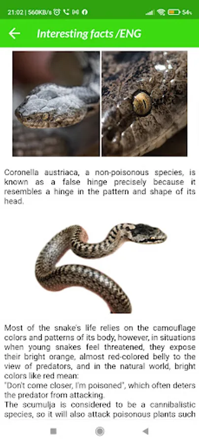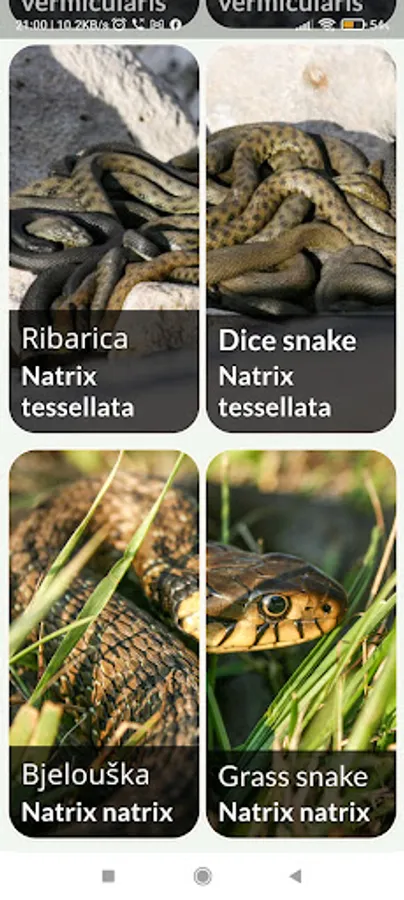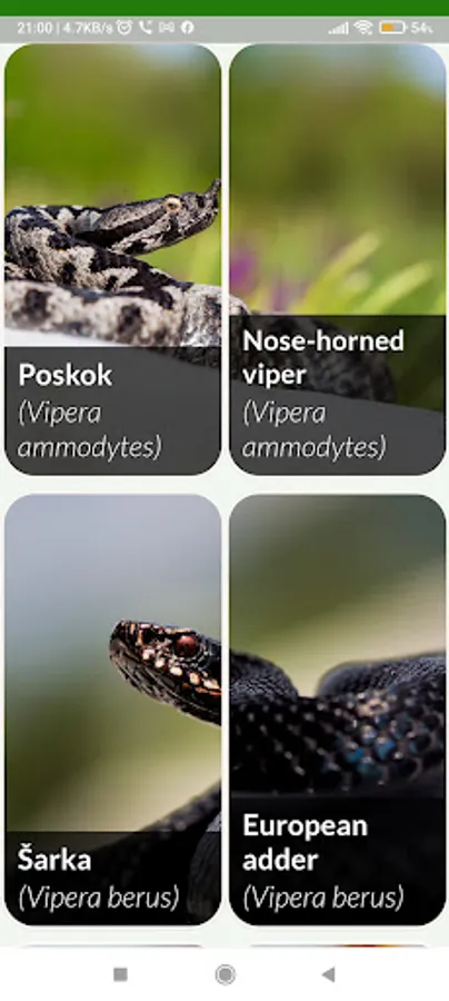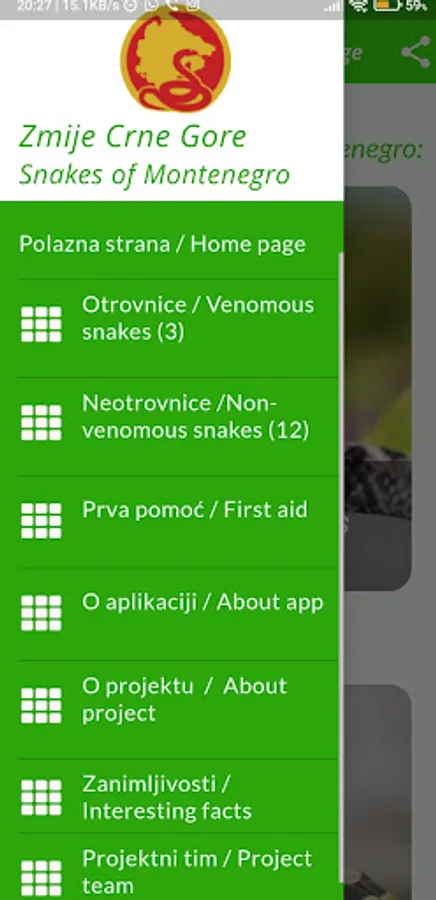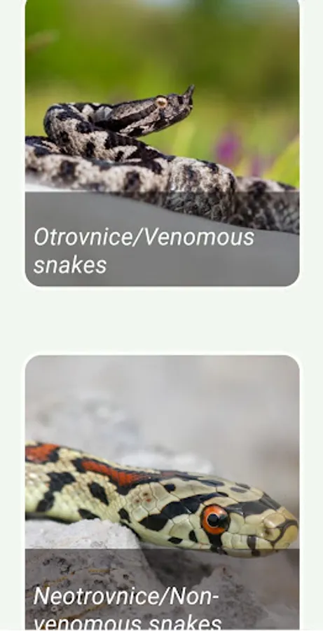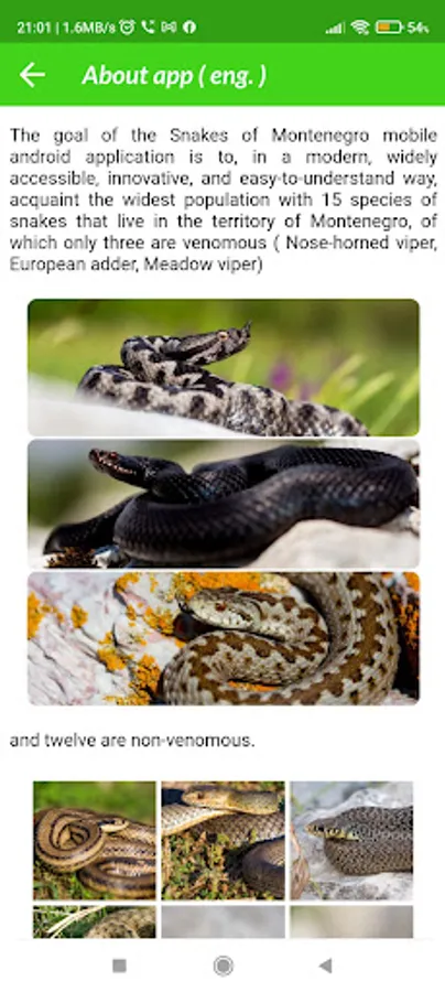 The goal of the Snakes of Montenegro mobile android application is to, in a modern, widely accessible, innovative and easy-to-understand way, acquaint the widest population with 15 species of snakes that live in the territory of Montenegro, of which only three species are venomous (Nose-horned viper, European adder and Meadow viper) and twelve are non-venomous.