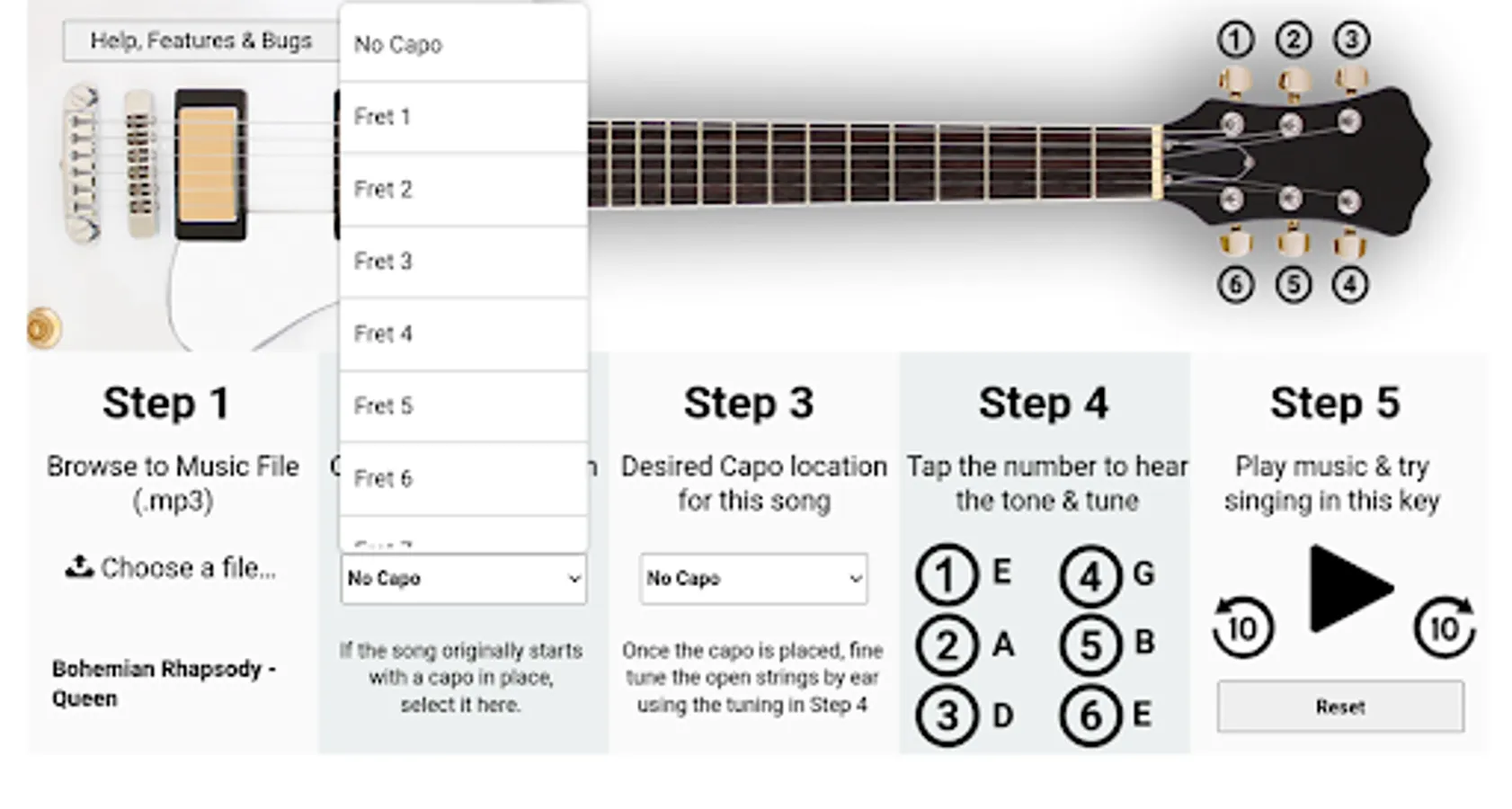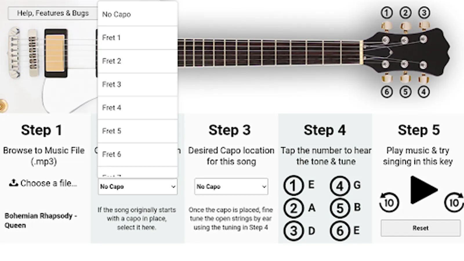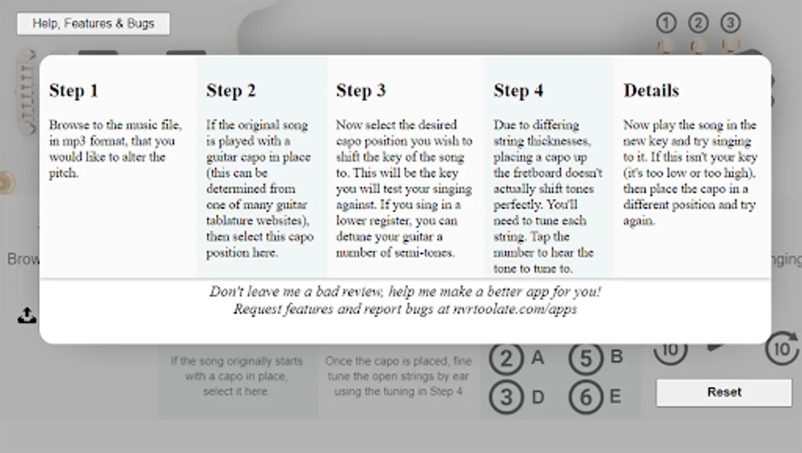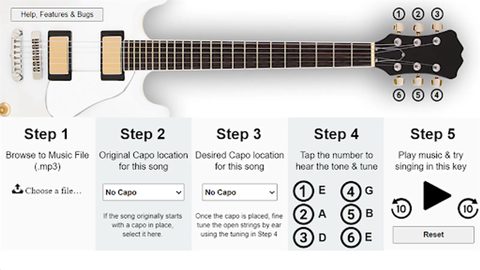 And if you tend to sing at a lower key then most, then the app will allow you to hear how the song would sound if the guitar was detuned (no capo) below a guitar's standard tuning of EADGBE.