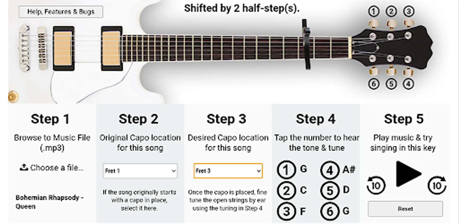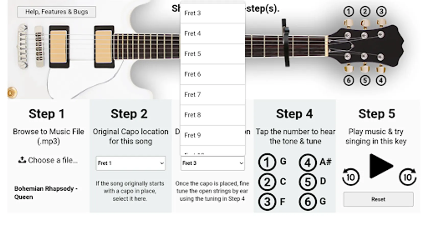 If you're a vocalist / singer and find it difficult to sing in the key of some songs, this app will allow you to change the pitch of a song in (.mp3 format) any number of semi-tones up or down from the original key, so you can figure out the most suitable register for you. If you're a guitarist, or sing along to a guitarist, you can specify a capo position and listen to how the song would sound, if the original song had the capo in this position when first written. You can then try singing along to it, and ascertain if it is a suitable key for you. If it isn't, then choose a different capo position and try again.