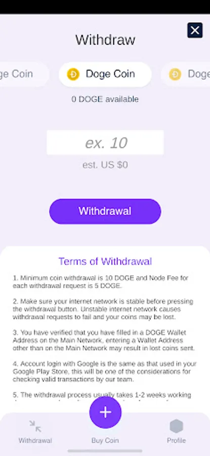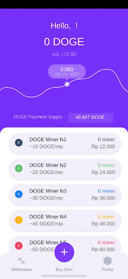 Doge Coin Miner V2 is an application that allows you to buy virtual coin mining tools, here are several types of tools that can be purchased with a maximum purchase of 50 units. This application is not a money maker, but this application is only to facilitate you to buy mining tools virtually, of course the results from coin mining can be withdrawn to your wallet address with a minimum withdrawal. Payment processing time from the withdrawal date is 1-2 wee days (checked first by our team unilaterally, if it passes the indication, payment will be made immediately).