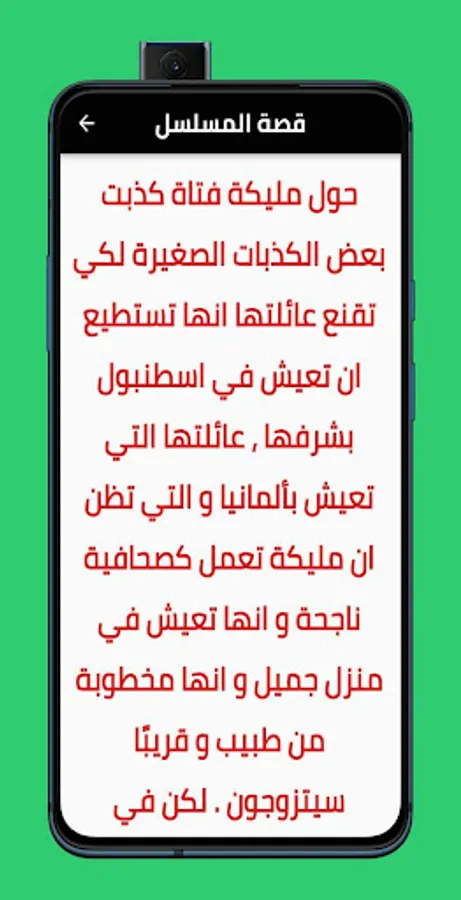 About Malika, a girl who tells some small lies in order to convince her family that she can live in Istanbul with her honor. But in fact, Malika is a clumsy and nervous girl