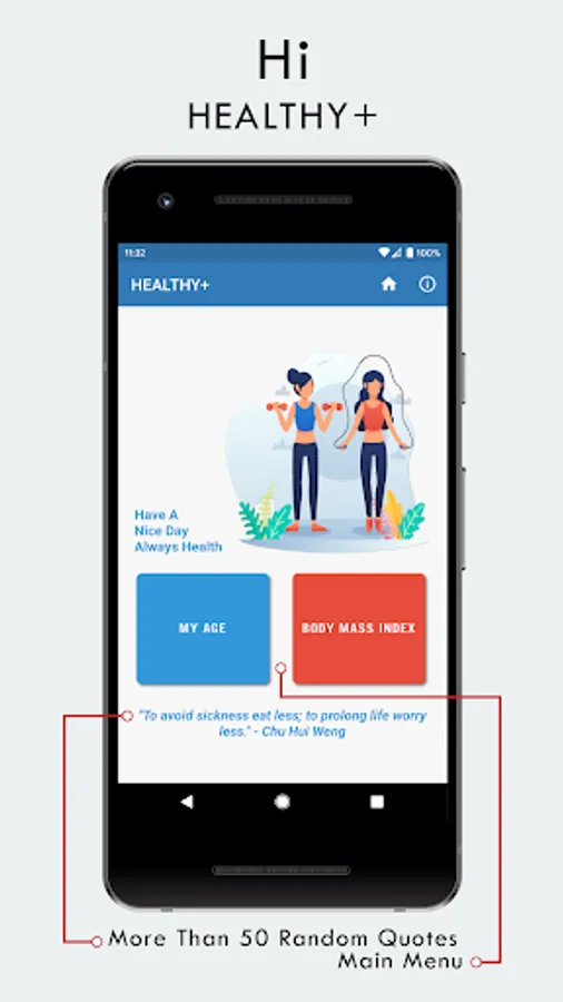 HEALTHY+ pron "Healthy Plus"  contains about health, for now there is content to know how old are you and your body mass index (BMI calculate). This application is intended for all people in the world to help find out about their health.