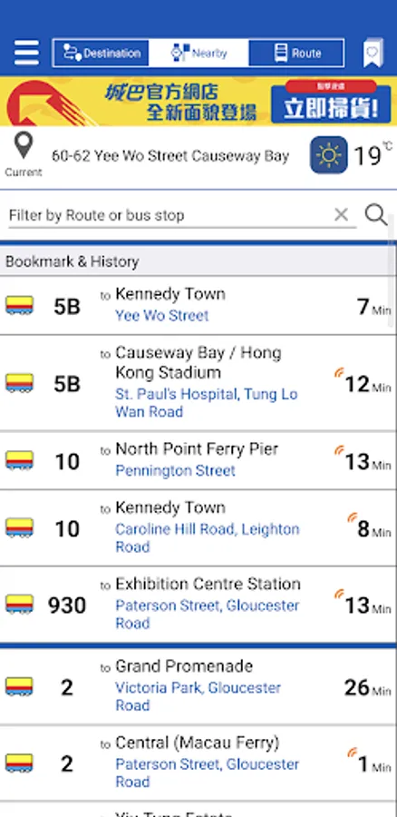 - By clicking the new “Destination” button at main page, the system will suggest direct Citybus routes from user current location to the selected destination, with ETA to the nearest bus stop.