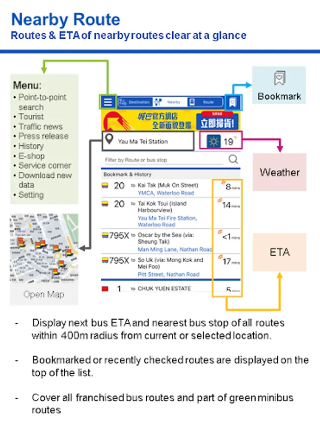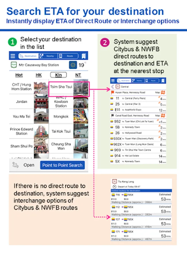- Display ETA of the next 3 arrivals within 60 minutes of all Citybus routes, including KMB and Long Win departures for jointly operated routes and the ETA of Kowloon Motor Bus / Long Win Bus, New Lantao Bus and Green minibuses provided by Data.gov.hk