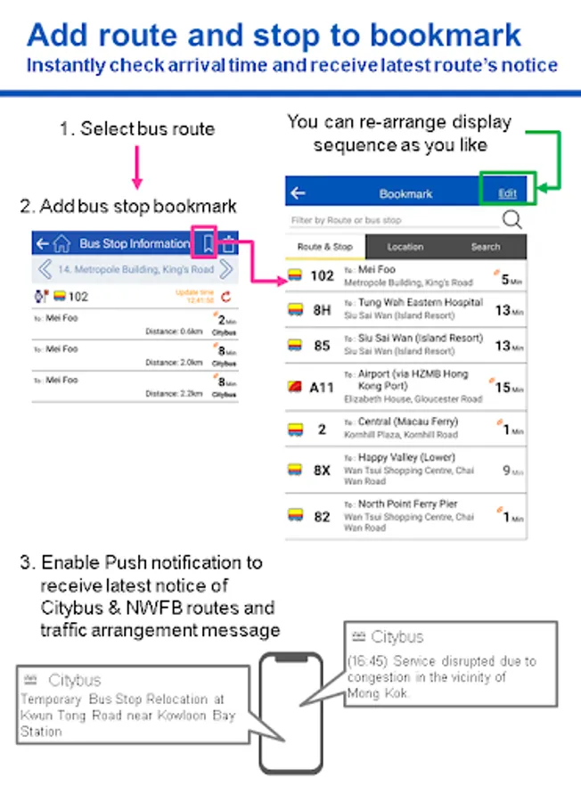 - Retrieve next bus ETA of desired routes in the “Bookmark” page after bookmarking a route and bus stop. Sequence of the bookmarks can be “Edited” to put favorite routes on top.