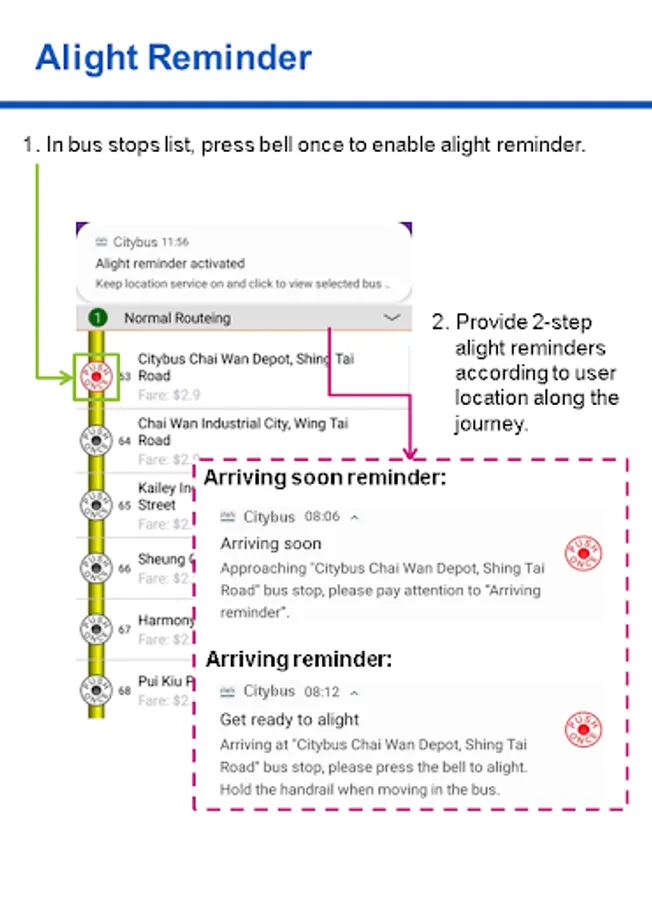 - When alight reminder is enabled, the app uses location service of your device continuously until arriving at the selected bus stop, which may drain battery.