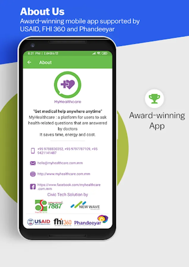 • Award-winning mobile app supported by USAID, FHI 360 and Phandeeyar