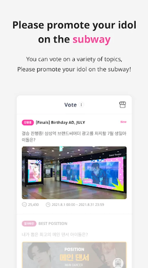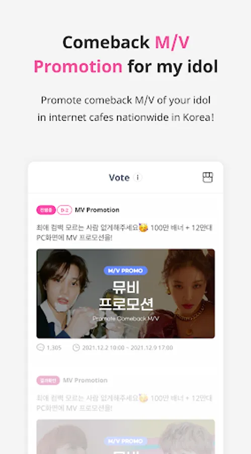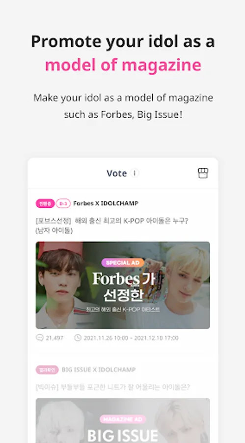 - Please support your artist with various benefits that can only be seen on IDOLCHAMP, such as subway ads, outdoor ads, PC bang music videos ads, magazine ads, and YouTube ads.