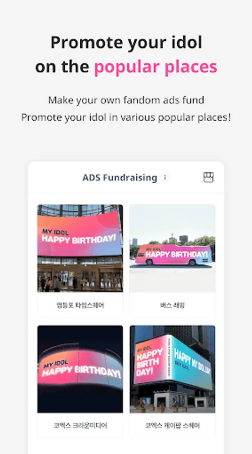 - At IDOLCHAMP, you can cheer for artists with outdoor ads you want by raising money for fandom advertisements.