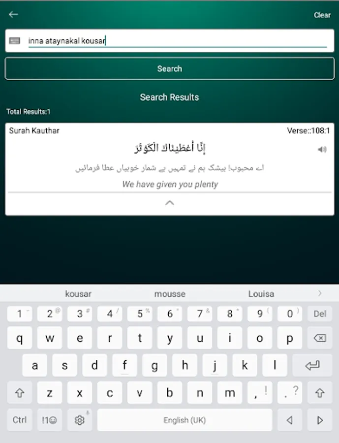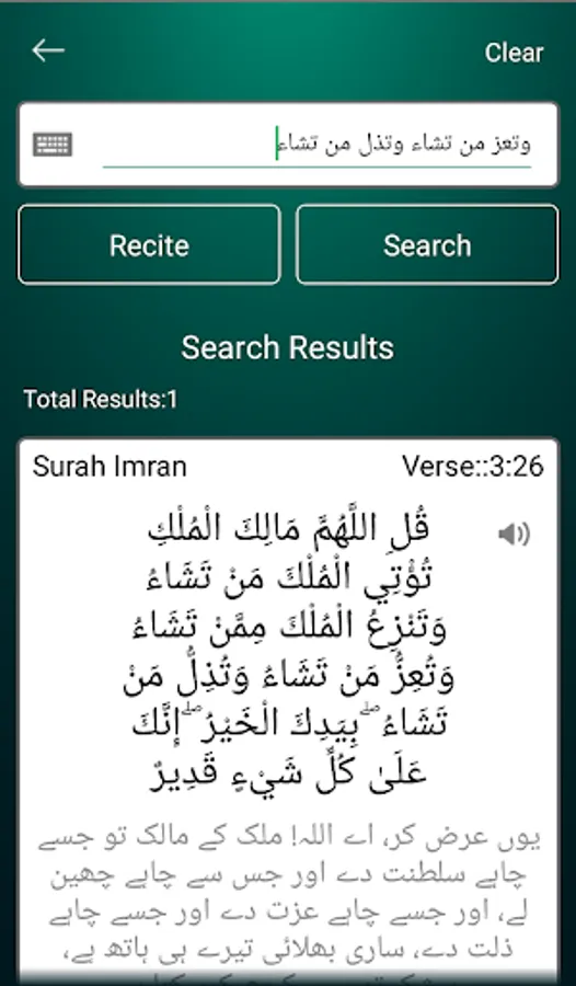 For getting the actual pronunciation user can listen the audio from the database and images of verses are also available in the database. Moreover, translation in English and in Urdu is also available for better user experience.