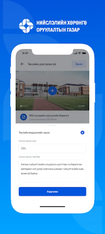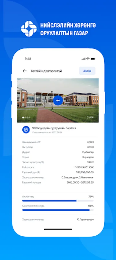 Нийслэлийн Хөрөнгө оруулалтын газраар Улс, Нийслэл, Орон нутгийн хөгжлийн сангийн хөрөнгө оруулалт, гадаадын зээл, тусламж болон бусад хөрөнгийн эх үүсвэрээр Нийслэл хотод хэрэгжүүлж буй төсөл арга хэмжээ, барилга байгууламж, их засвар тохижилт, бүтээн байгуулалтын ажилд захиалагчийн техникийн хяналтыг хэрэгжүүлэн ажилладаг бөгөөд та бүтээн байгуулалтын ажлын явцын мэдээлэлтэй танилцаж, хяналт тавих боломжтой.