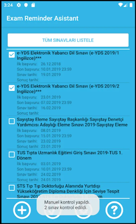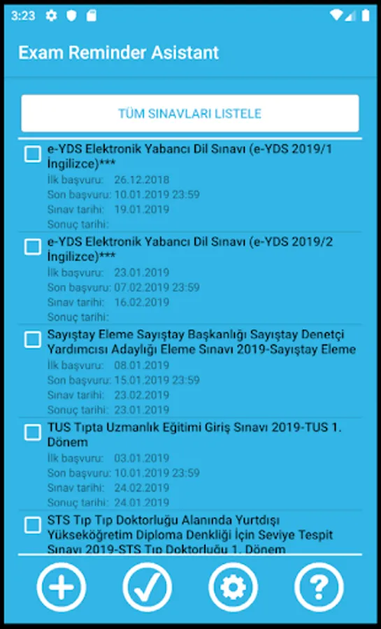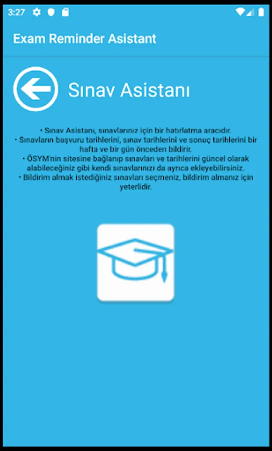 It informs the application dates, exam dates and result dates of the exams one week and one day in advance. Exam assistant.