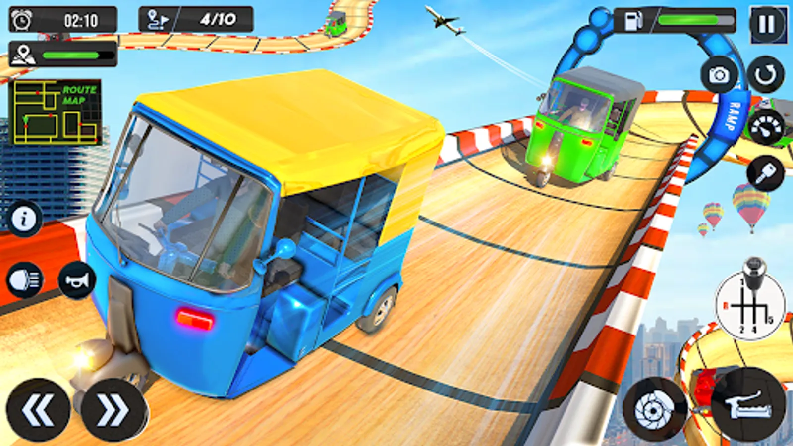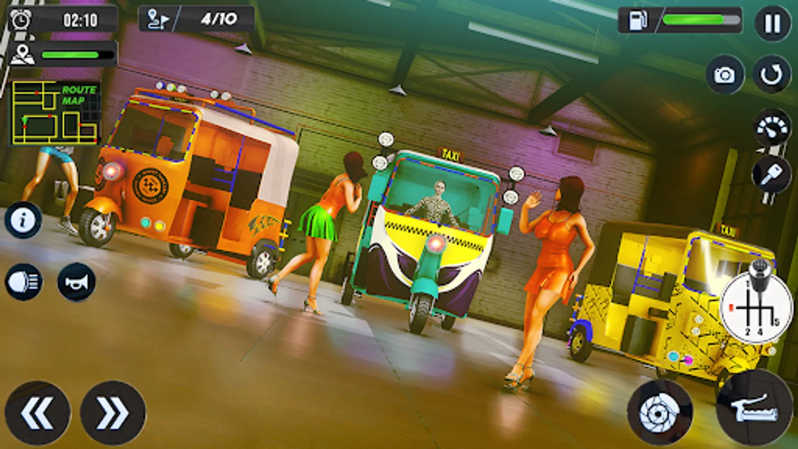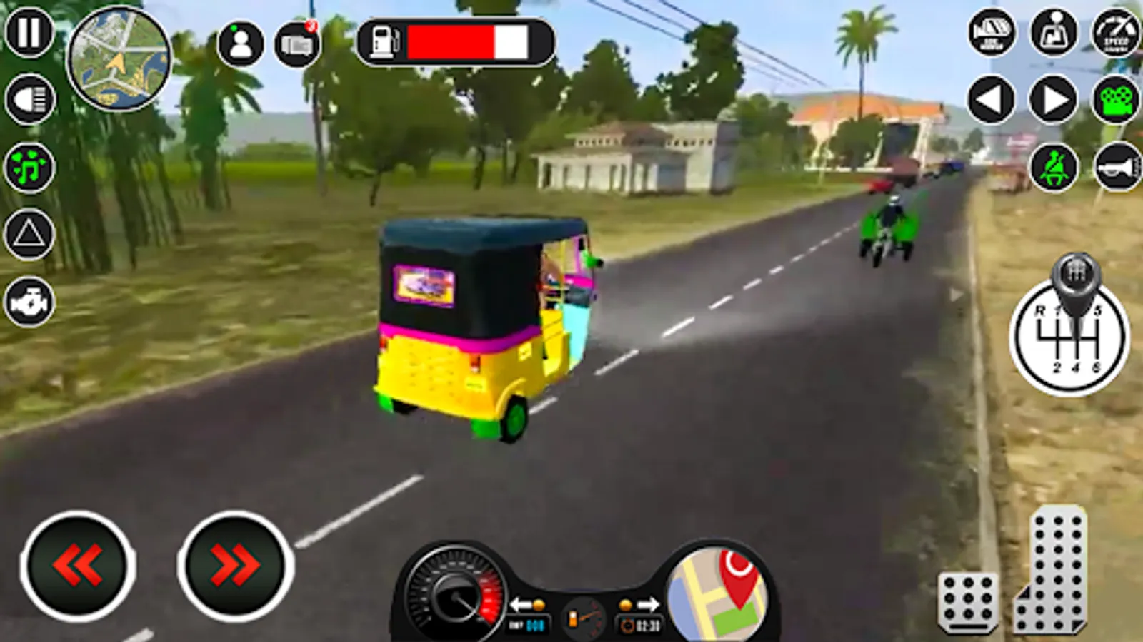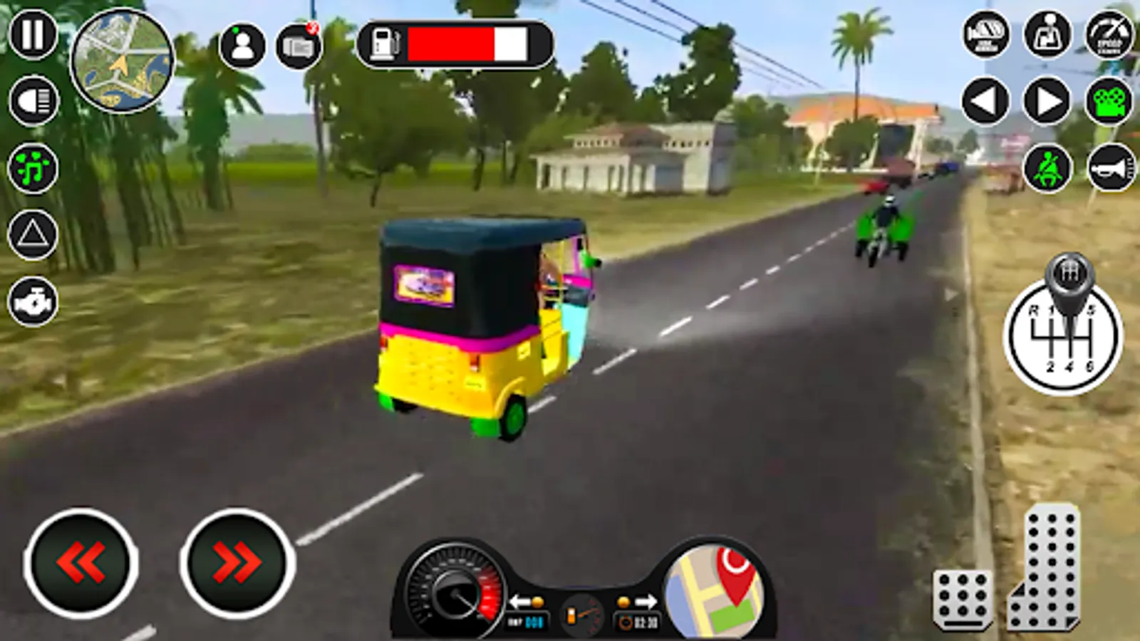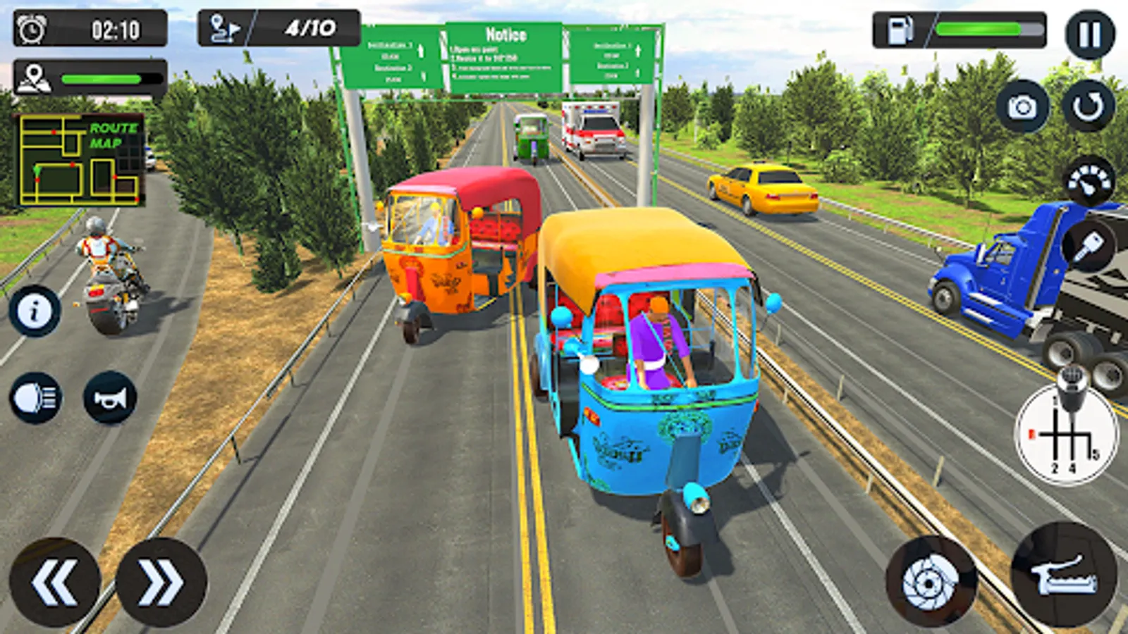 modern HD graphics; intense 3D environments; simple and smooth control; amazing gameplay sound; challenging and easy to play; multiple controls available; experience highway and traffic racing; enjoy endless racing; keep an eye on the fuel bar; realistic natural views in offroad mode; pick-up and drop facility for travelers; stunning animations added; multiple auto-rickshaws for driving.