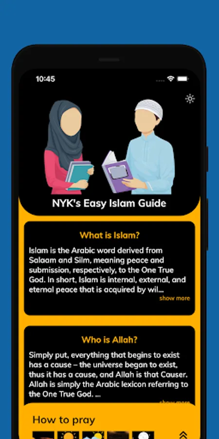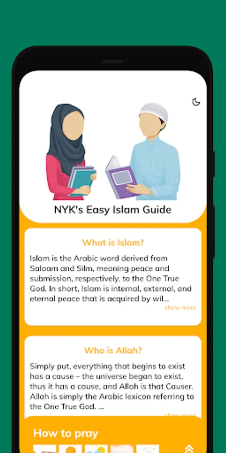 Easy Islam is a comprehensive yet beginner friendly guide for new Muslims. In it users will find explanations to common questions about fundamental Islamic beliefs and practices like :-