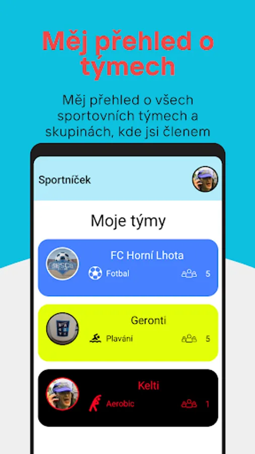 The Sportníček application is a simple and very effective sports team manager for all events. Manage, organize, communicate with your team or sports group. It is suitable for practically any sport or group entertainment, from football and hockey to chess to poker or fitness.