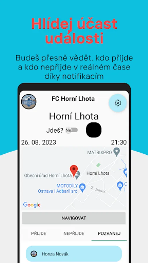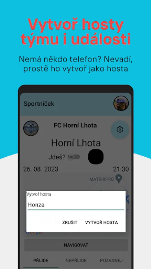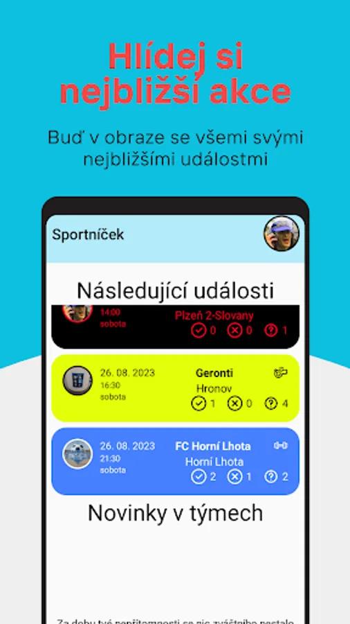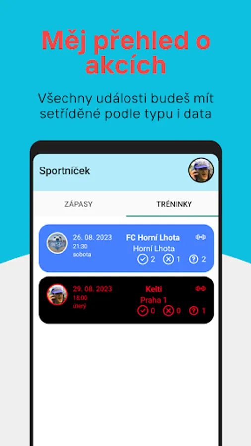 You can start a team or, thanks to an invitation from a teammate, join an already existing sports team and organize your entire sports life. Leaders and team members have an immediate overview of the participation or non-participation of individual teammates. You will have all the events and sporting events, including the participants, arranged clearly with you. Want to resolve a guest who doesn't have an Android phone? You also have such an option in Sportníček.