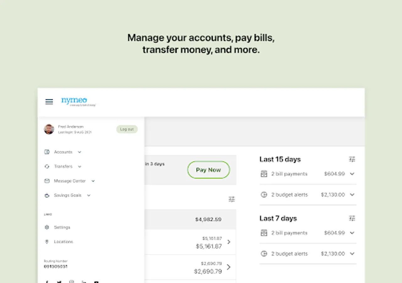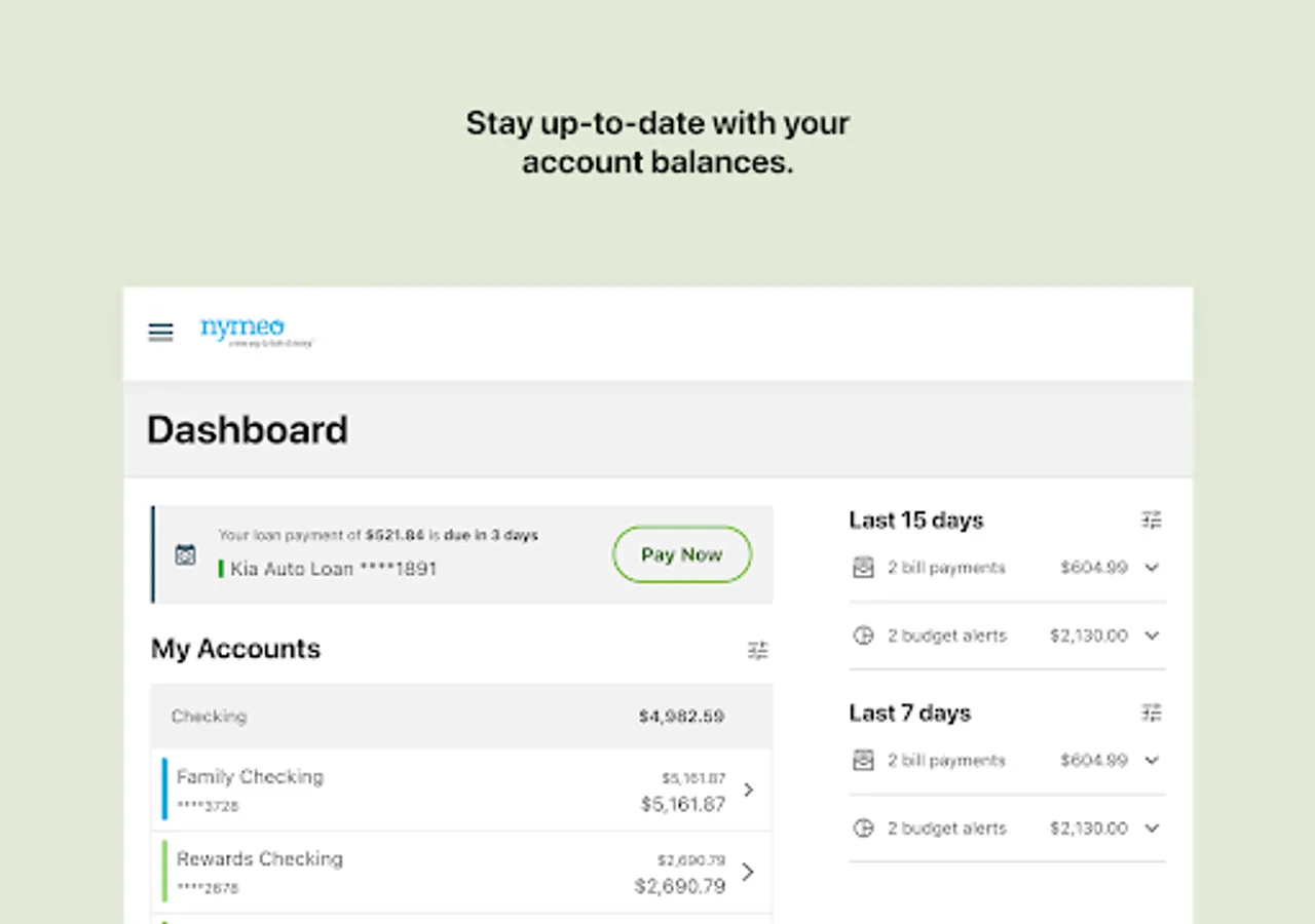 Nymeo Mobile Banking is FREE and SECURE. Security includes the latest in SSL encryption and is backed by online banking secure sign-on – so you never have to worry about sacrificing convenience for peace of mind.