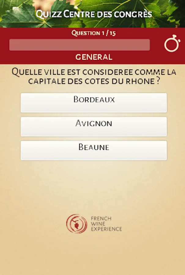 With this specialist French wine quiz, test your knowledge and improve your knowledge about wine. This quiz consists of 15 questions in specific themes, you will become unbeatable during the wine tasting. Châteauneuf-du-Pape, Gevrey-Chambertin, Saint Joseph, Cote Rotie, Bordeaux ... great wines and grape varieties will have no secret for you.