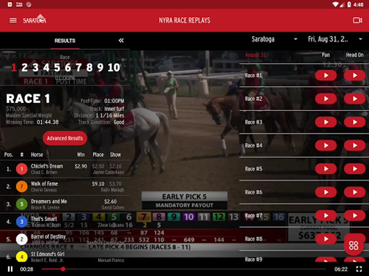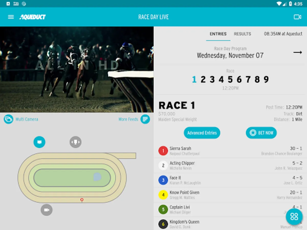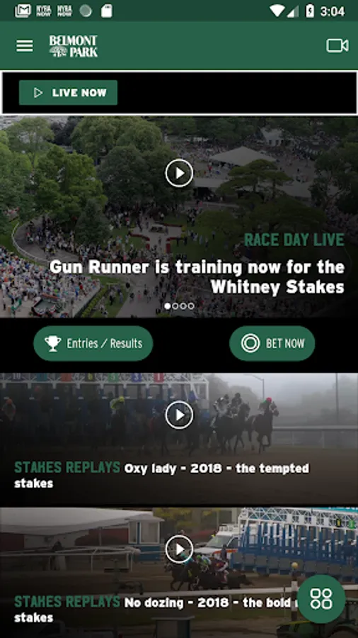 NYRA Now gives NYRA Bets members the ability to watch racing from NYRA tracks live in HD from a multitude of camera angles, including the side-view camera, head-on camera, finish line camera, or stretch-view camera. Additionally, fans can watch the saddling paddock to catch all the pre-race action, or utilize the trackside cameras to watch morning workouts. Plus, the Simulcast Center enables fans to access simulcast content from anywhere. Stream race replays from tracks across the nation, look ahead to feature races and access entries and results.
