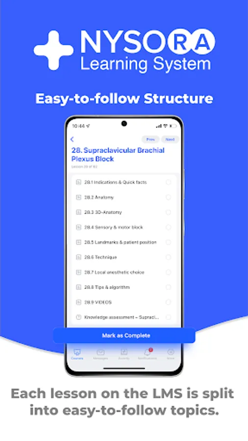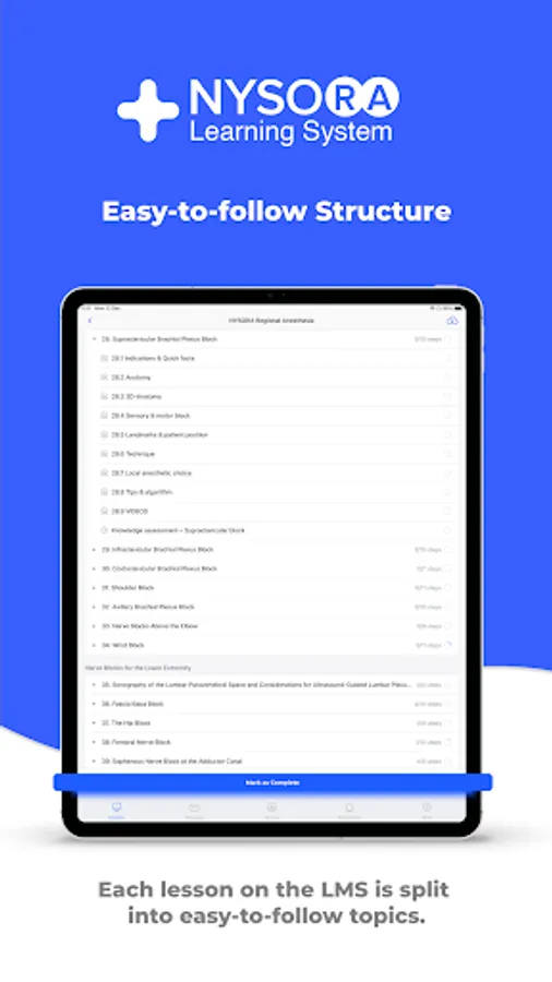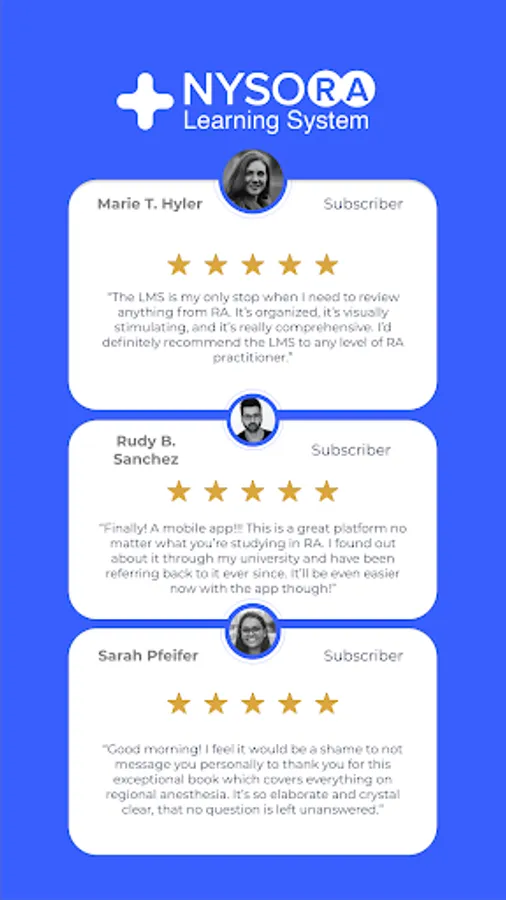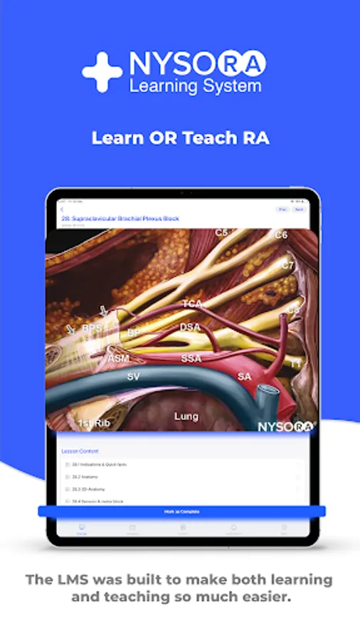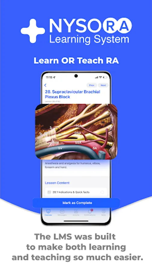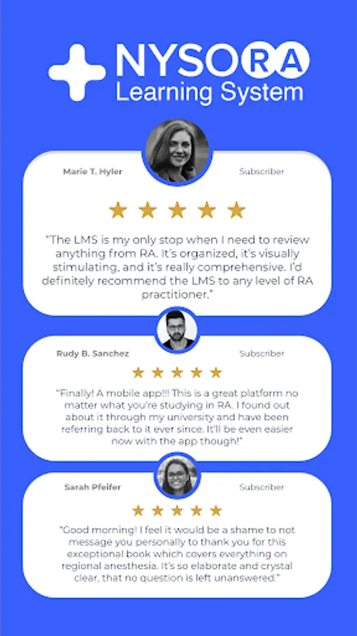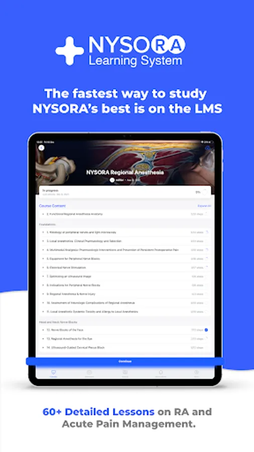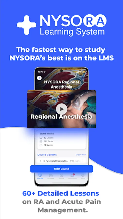 The NYSORA LMS is the most practical, comprehensive, and illustrated way to learn or teach all things regional anesthesia and beyond. Access the most practical information on regional anesthesia, organized to aid your studying. Join 5k+ of your colleagues on the NYSORA LMS platform, and instantly unlock all of these benefits: