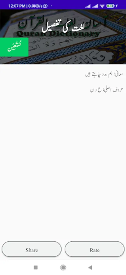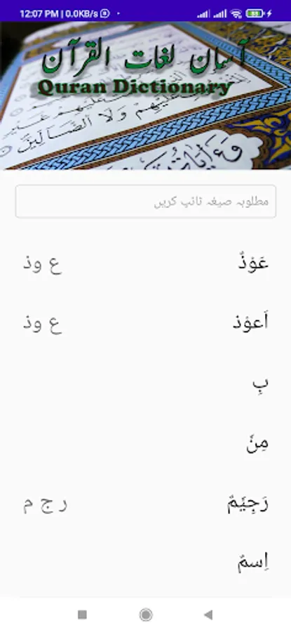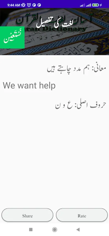 This dictionary provide Word meanings and the word it is derived from or the letter through which one can find meaning of the word in an Arabic Dictionary.