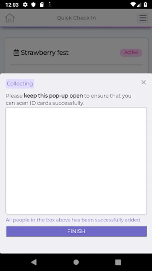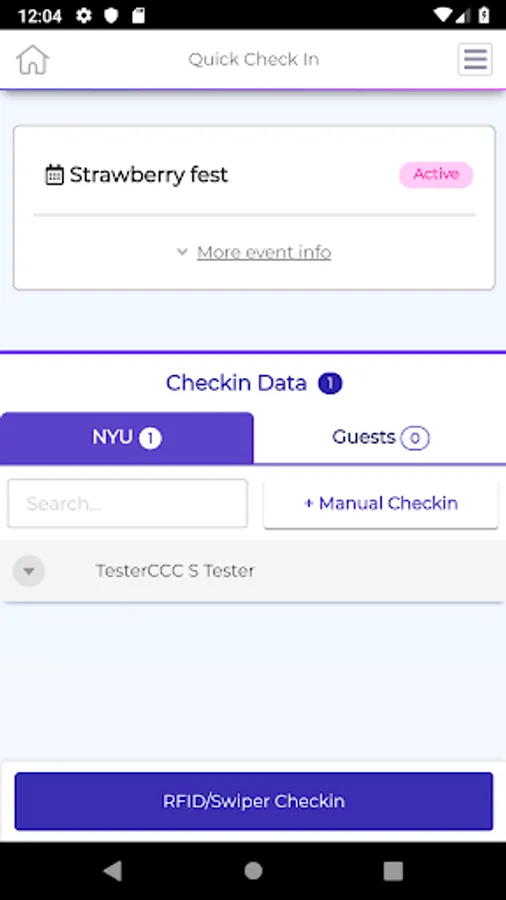 Events Check-In is an app intended for use by NYU community. It utilizes online and mobile components designed to streamline the event check-in process. Before an event, users log into the Events Check-In web app, create the event, and obtain a QR code along with a token for distribution. Users in charge of checking in event attendees will scan or input the distributed code, connect an ID swiper, and begin checking in attendees.