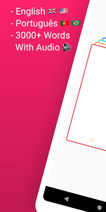 Our app will help you learn a new language easier. We made flashcards feature, it is easy to use and you can learn new words or review old ones. Just flip the card to see translation and listen the voice pronunciation of the words by tapping the speaker icon. You can switch the side of the cards and use it from Portuguese to English or English to Portuguese.