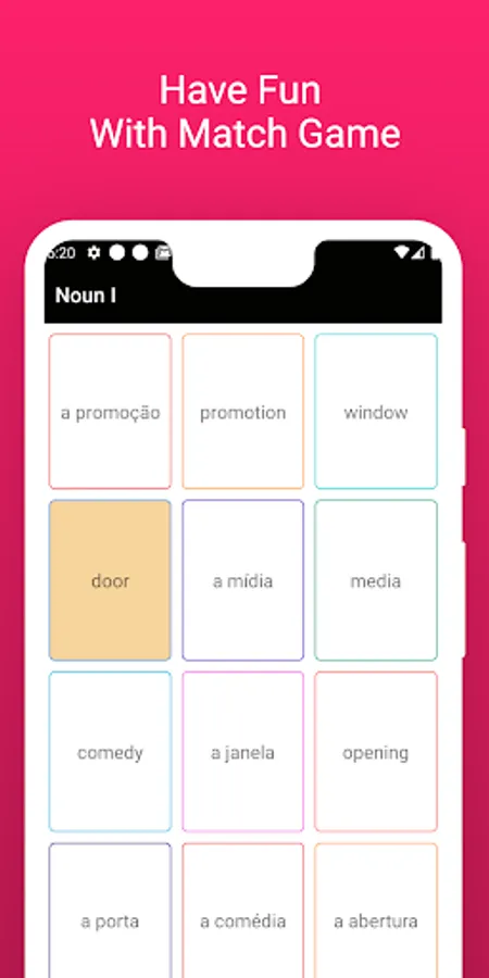 Last feature is card matching. It is designed to improve your visual memorization and help you learn words even better. Tap the cards on the screen and select the matching translations with each other. Fun for everyone thanks to an easy to use interface.