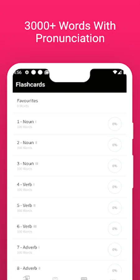 Other feature is tests. You can quiz your knowledge with this feature. Each question comes with a word and four options to select. Select the right answer and improve your score. Also listen the sound of the word by tapping to speaker icon and learn even better.