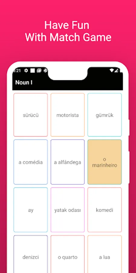 Last feature is card matching. It is designed to improve your visual memorization and help you learn words even better. Tap the cards on the screen and select the matching translations with each other. Fun for everyone thanks to an easy to use interface.