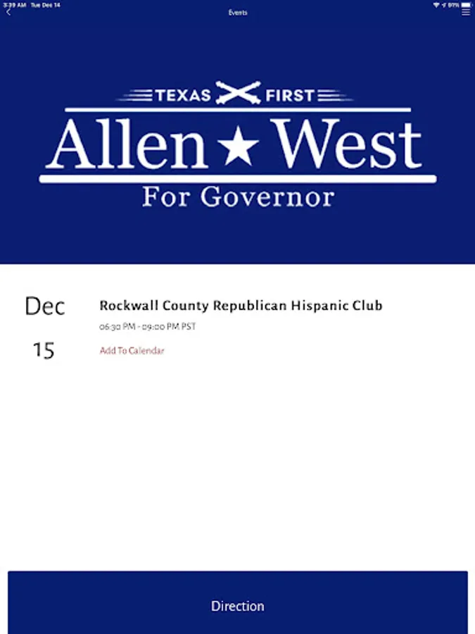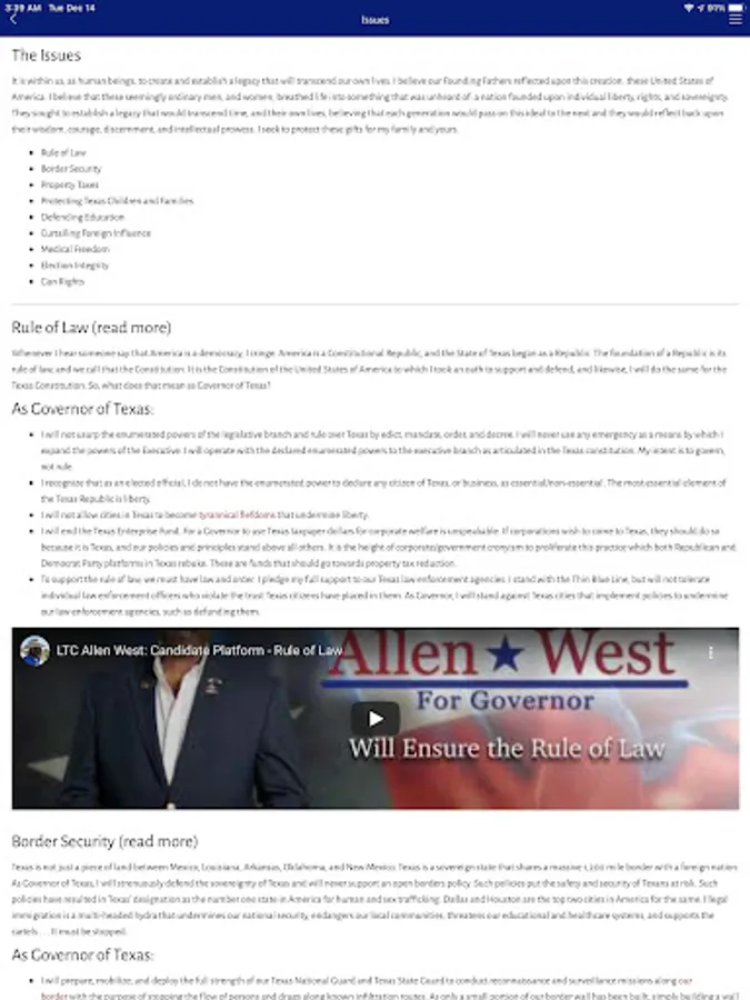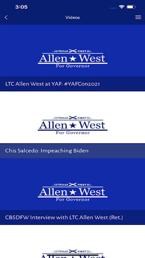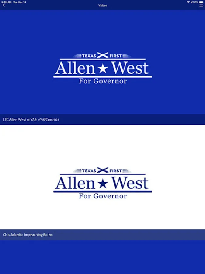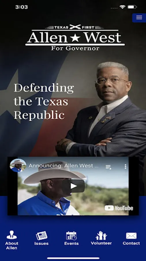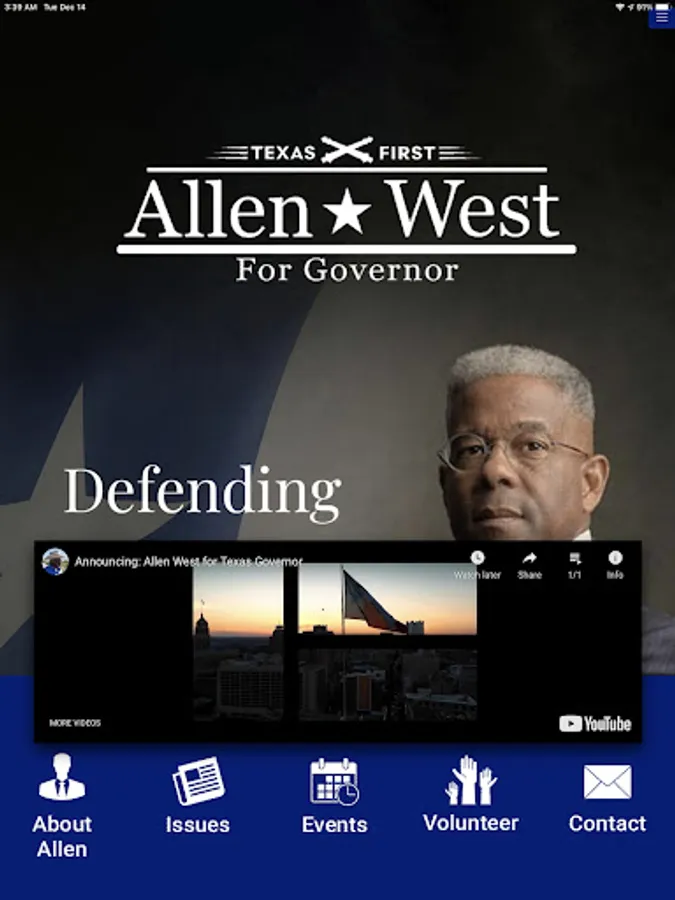 Download the app to learn about Allen West and the important platform issues, check out the next important event, watch his latest video, find out how to volunteer and other ways to support his campaign, follow him on social media and receive important news and reminders via push notifications!