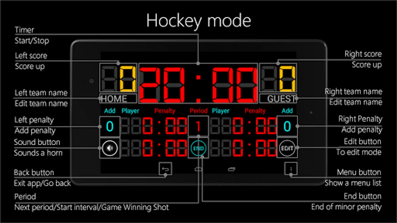 -Menu button, you can sounds horn, switch sides, reset timer, reset penalty, reset all, settings.