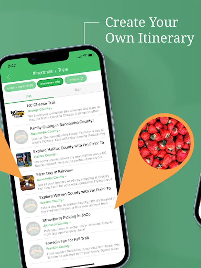 Explore North Carolina’s diverse offering of farms, products and destinations. The Visit NC Farms app is your guide to find and connect with farms and fisheries, farmers markets, pick-your-own produce, local food, lodging on farms and more. Perfect for planning a quick family activity or an extended getaway. Customize your itinerary and find out what makes agriculture in North Carolina so special.