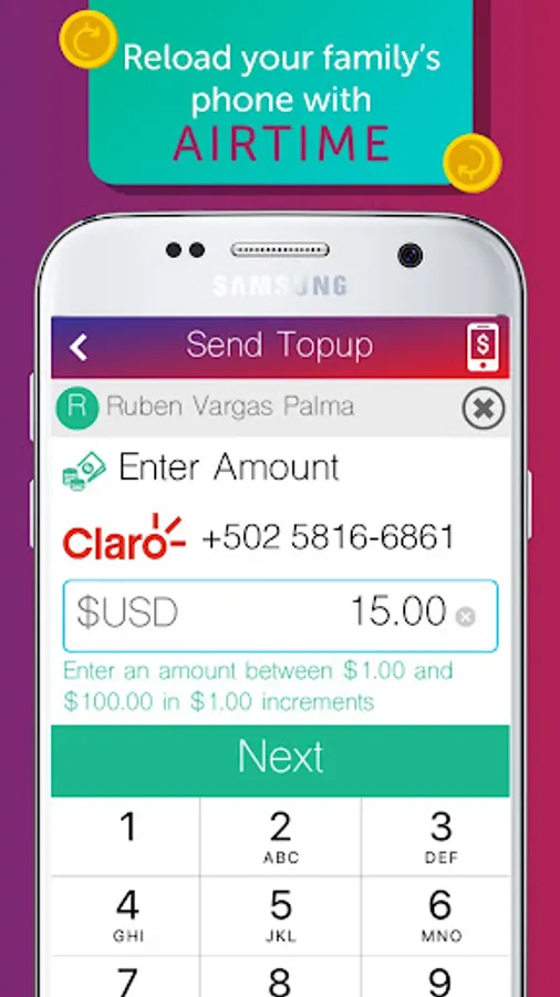 * Users and Beneficiaries in Central and South America must have a Claro or Telcel phone number to receive money and airtime topups. Not available in all U.S. states. Contact us for further details.