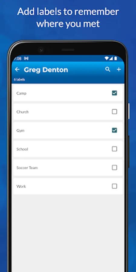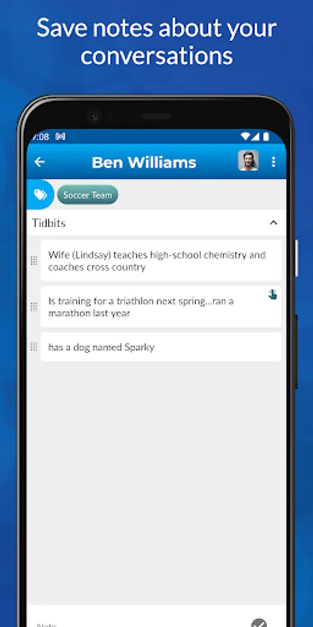 Be more mindful of new relationships and strengthen existing ones. Quickly jot down a person's name and a few notes about your conversation, and assign labels to stay organized. Need to pull up a person's info on the fly? Search by name, label, or notes to find someone lickety-split!