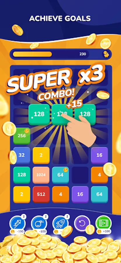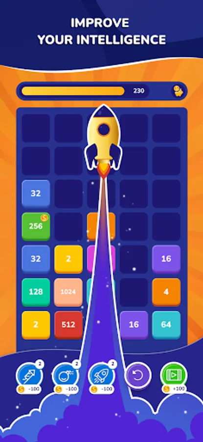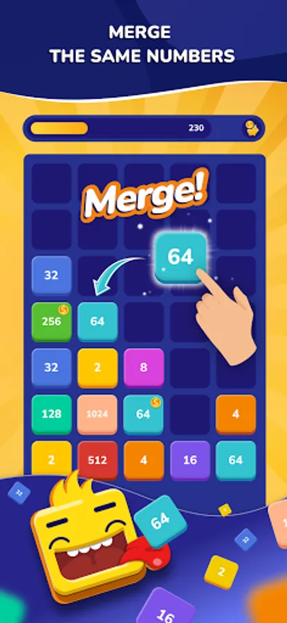 Your goal is to merge blocks with the same numbers. Merging of blocks leads to the doubling of numerical value. For merging it is enough to drag the required block across the playing field and collide it to the other block. You can merge blocks by touching any of the sides: left, right, top or bottom.